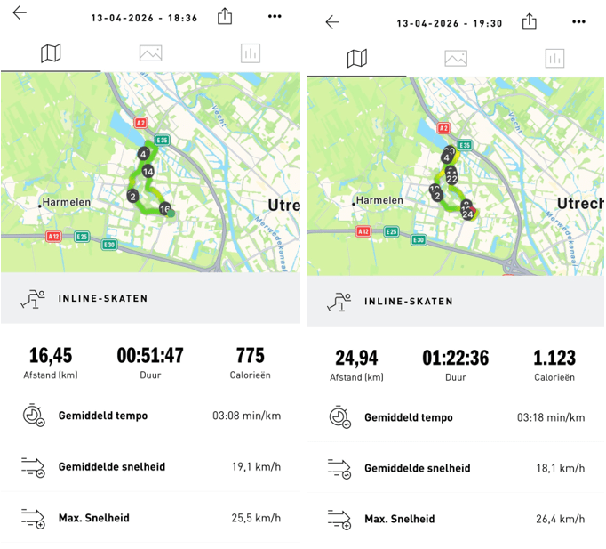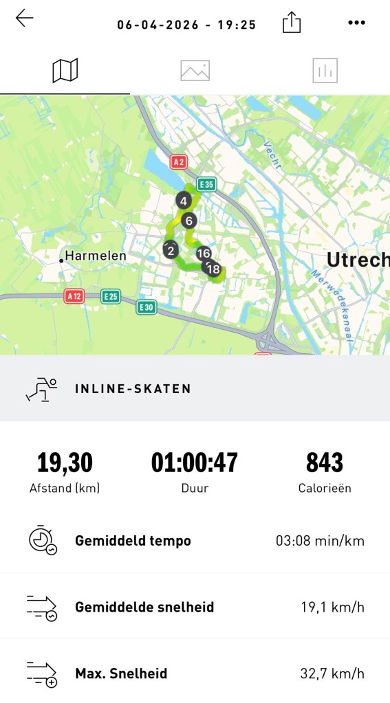 Maandag 13 april, wel regen, geen regen, buienradar geeft een andere voorspelling dan buienalarm. Om 18:00 de knoop maar doorgehakt, wij gaan skaten. Na twee ‘voorlooprondjes’ om 19:30 bij de Romeinse wachttoren, blijkbaar hadden niet veel skaters er vertrouwen in, alleen Dennis en Ingo stonden al te wachten. Femke stuurde een berichtje dat ze ons tegemoet zou rijden en dus laten zou aansluiten. Om 19:32 vetrokken richting zwembad, duidelijk werd dat de wind aan het draaien was t.o.v. de twee eerdere rondjes. Tussen zwembad en Haarrijnse plas sloot Femke zoals beloofd aan. Met z’n vieren lekker doorgereden, qua wind viel het uiteindelijk mee. na het tweede rondje ging Femke op weg naar huis en reden wij met z’n drieën verder. Bij elkaar drie grote ronden en één kleine, bij elkaar ongeveer 25km.